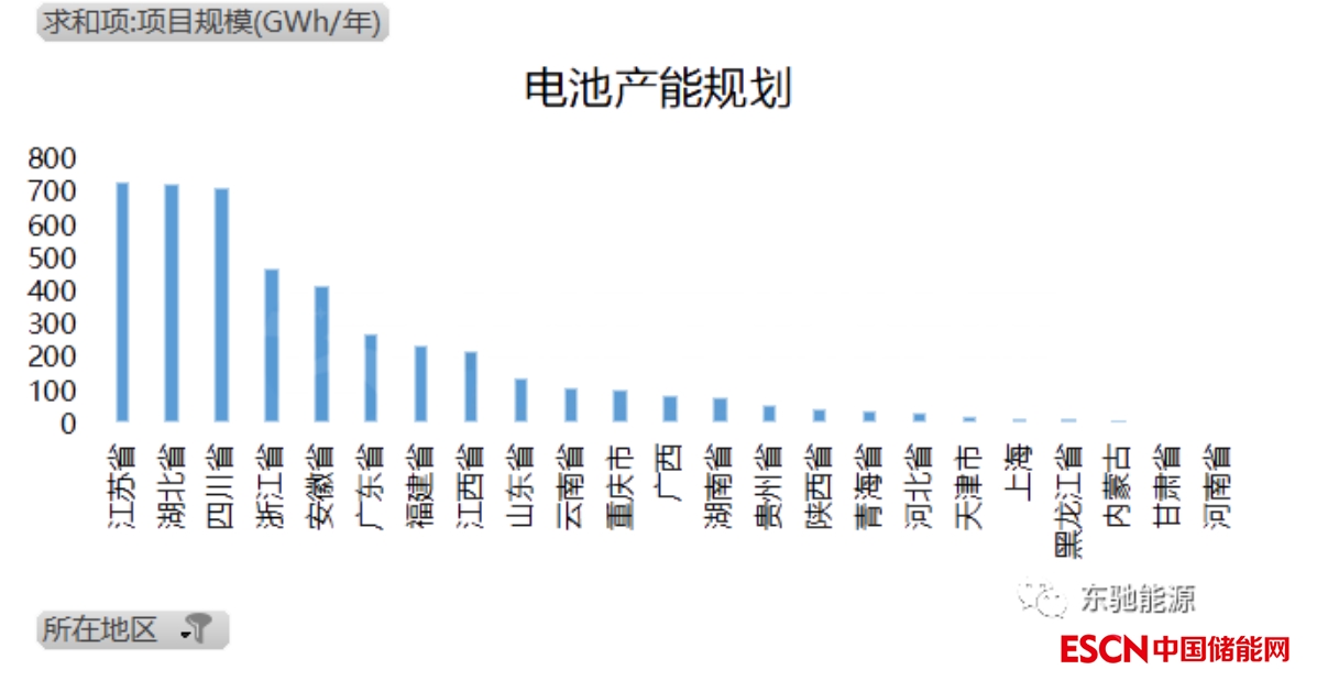 按省份來看,江蘇、湖北、四川電池產(chǎn)能第一梯隊、均超過700GWh,浙江、安徽、廣東、福建、江西等省份電池產(chǎn)能超過200GWh。