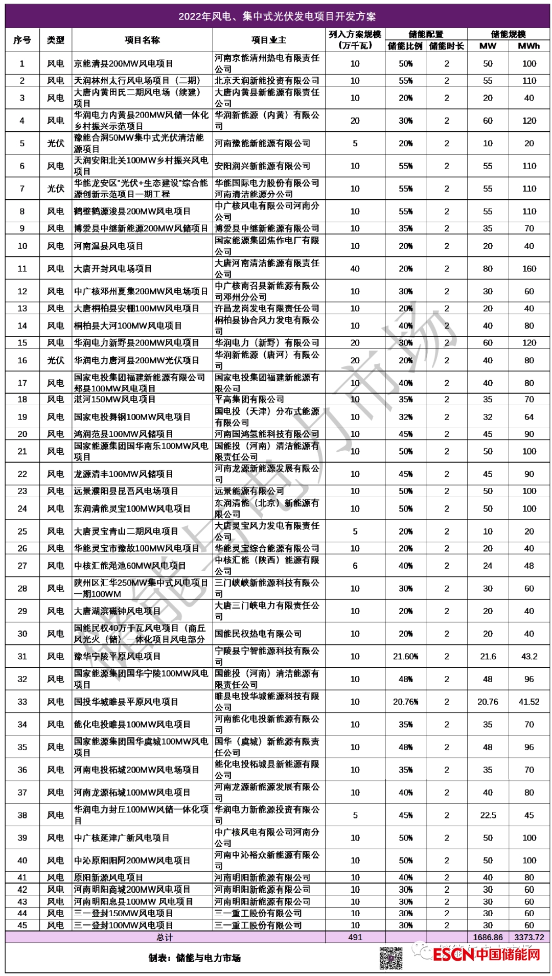 值得注意的是,集中式風(fēng)、光項目共491萬千瓦,并且集中式風(fēng)光項目均進(jìn)行了大規(guī)模的儲能配置。其中配置比例最高達(dá)55%/2小時,最低為20%/2小時,共計帶來儲能需求1.7GW/3.4GWh。