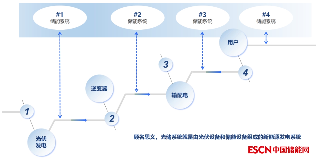 光儲(chǔ)系統(tǒng)就是由光伏設(shè)備和儲(chǔ)能設(shè)備組成的新能源發(fā)電系統(tǒng)。目前,儲(chǔ)能在光伏系統(tǒng)內(nèi)的應(yīng)用場(chǎng)景有四個(gè),如下圖所示。