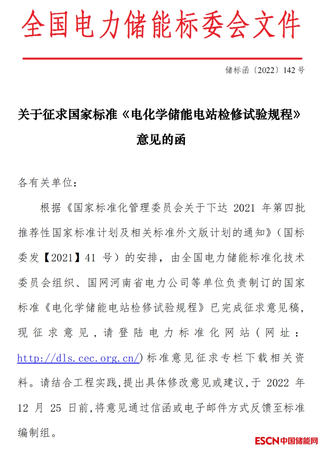 關于征求國家標準《電化學儲能電站檢修試驗規(guī)程》意見的函