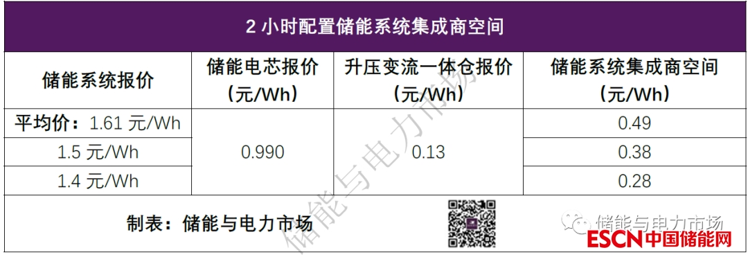 以本項(xiàng)目中電芯平均價(jià)為參考,刨去儲(chǔ)能系統(tǒng)電芯+升壓變流一體倉總成本1.120元/Wh(0.99+0.13),在不同的報(bào)價(jià)水平下,儲(chǔ)能集成商的實(shí)際空間如下表。