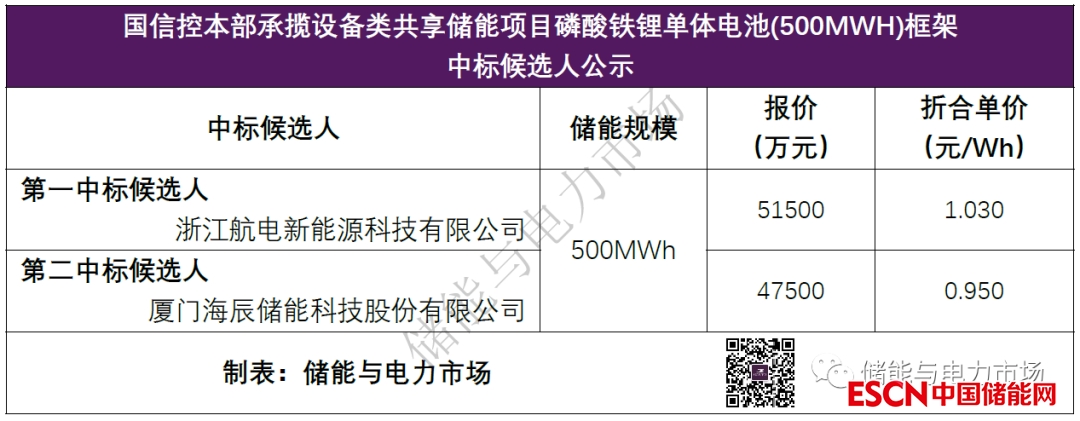中國儲(chǔ)能網(wǎng)訊:近日《國信控本部承攬?jiān)O(shè)備類共享儲(chǔ)能項(xiàng)目磷酸鐵鋰單體電池(500MWH)框架中標(biāo)候選人公示》對(duì)外發(fā)布,浙江航電新能源科技有限公司以總報(bào)價(jià)51500萬元,折合單價(jià)1.03元/Wh,成為第一中標(biāo)候選人。中標(biāo)候選人情況如下表所示。