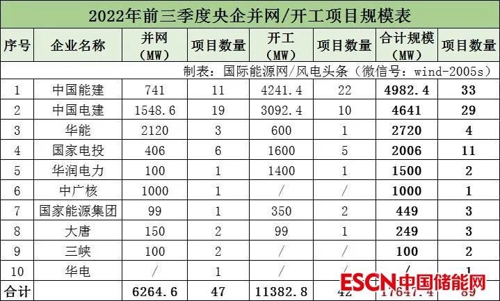 國際能源網(wǎng)/風(fēng)電頭條(微信號:wind-2005s)梳理發(fā)現(xiàn),根據(jù)統(tǒng)計,2022年前三季度并網(wǎng)及開工風(fēng)電項目規(guī)模超2GW的央企有中國能建、中國電建、華能、國家電投。并網(wǎng)及開工項目位列第一的央企是中國能建,裝機(jī)累計達(dá)4982.4MW,其次是中國電建,裝機(jī)達(dá)4641MW。