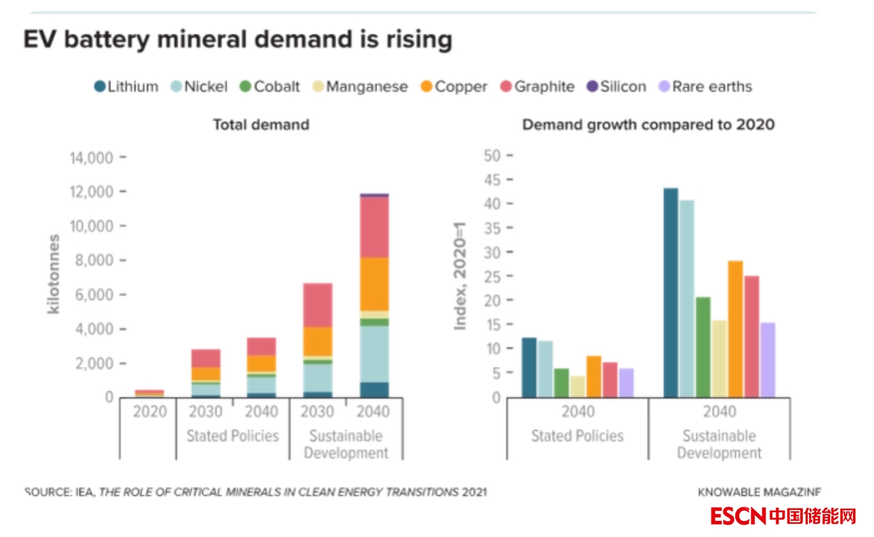 國際能源署預(yù)計,為了實現(xiàn)將全球氣溫上升幅度控制在遠(yuǎn)低于2攝氏度(可持續(xù)發(fā)展方案)的碳排放削減目標(biāo),針對幾種關(guān)鍵礦物的需求將會激增。如果各國只是按照目前的承諾(既定政策)采取行動,需求同樣會增加,只是增速較小。