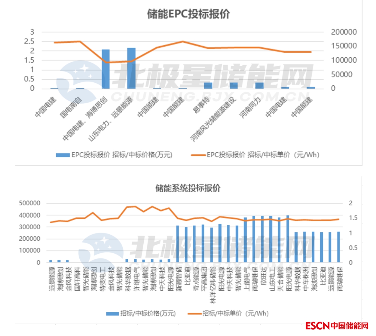 中標(biāo)價(jià)格方面,儲(chǔ)能系統(tǒng)采購類的投標(biāo)報(bào)價(jià)區(qū)間在1.36~1.89元/Wh,儲(chǔ)能EPC的投標(biāo)報(bào)價(jià)區(qū)間在1.39~2.51元/Wh之間。中標(biāo)單位方面,中國能建、中國電建(601669)、科華數(shù)據(jù)出現(xiàn)率最高,另外在投標(biāo)單位方面,海博思創(chuàng)、智光儲(chǔ)能表現(xiàn)活躍,分別參與4個(gè)項(xiàng)目采購開標(biāo)。