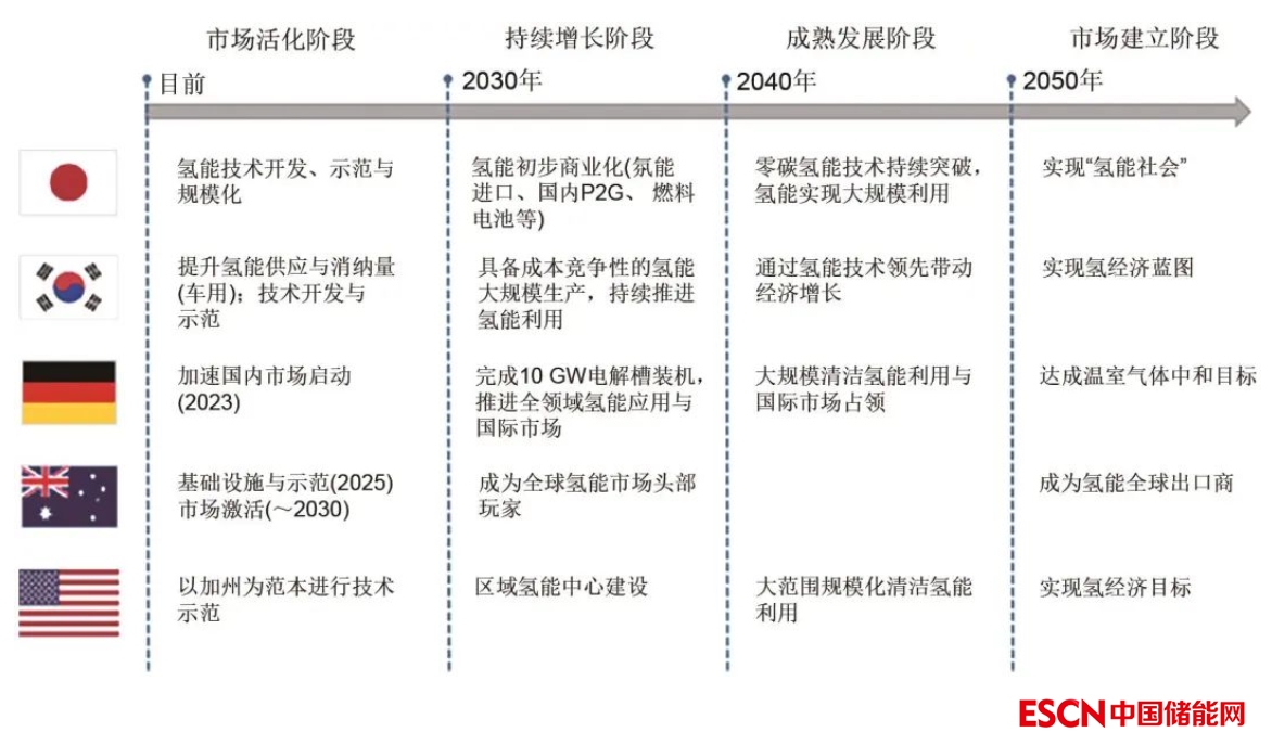 從主要國家的氫能戰(zhàn)略來看,“氫經(jīng)濟(jì)”基本均通過市場培育、快速增長和成熟發(fā)展3個(gè)階段實(shí)現(xiàn)。從目前到2030年前,可視為市場培育階段,該階段內(nèi)技術(shù)研發(fā)與示范對(duì)氫能產(chǎn)業(yè)規(guī)模的增長影響巨大,各國均構(gòu)建了各具特色的氫能與燃料電池研發(fā)體系,伴隨技術(shù)成熟、基礎(chǔ)設(shè)施建設(shè)、氫能需求增加達(dá)到激活市場的效果。2030—2040年為持續(xù)增長階段,大多數(shù)國家都計(jì)劃依托前期示范成果建設(shè)大規(guī)模氫能利用體系,例如德國10 GW電解槽裝機(jī)計(jì)劃、歐盟500 GW綠氫行動(dòng)計(jì)劃、韓國大規(guī)模氫能供應(yīng)計(jì)劃等,以促進(jìn)氫能大規(guī)模商業(yè)化利用。2040—2050年氫能產(chǎn)業(yè)步入成熟發(fā)展階段,氫能產(chǎn)業(yè)市場基本建立。
