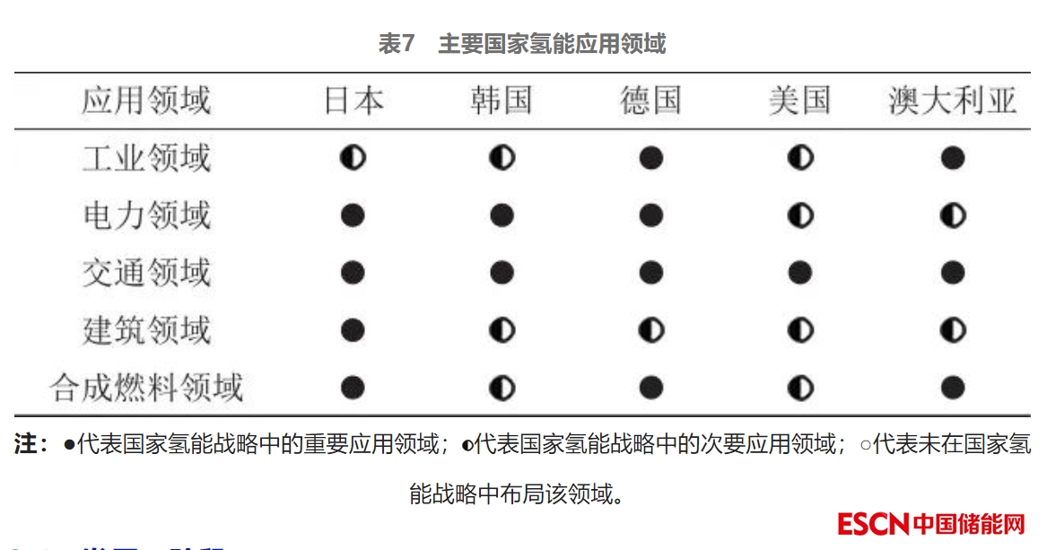 注:●代表國家氫能戰(zhàn)略中的重要應(yīng)用領(lǐng)域;圖片代表國家氫能戰(zhàn)略中的次要應(yīng)用領(lǐng)域;○代表未在國家氫能戰(zhàn)略中布局該領(lǐng)域。