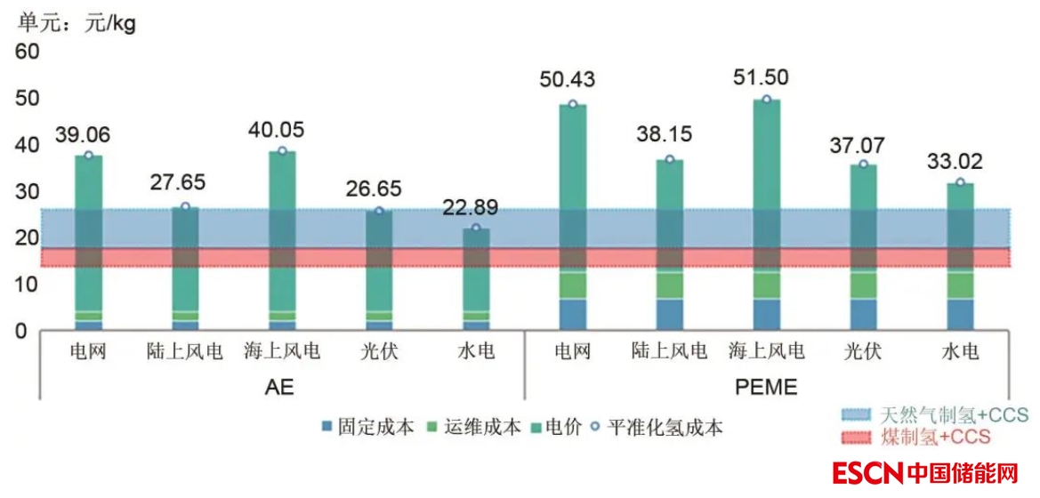 可再生氫的平準(zhǔn)化成本成為各國氫源結(jié)構(gòu)過渡的關(guān)鍵??稍偕鷼涑杀局饕Q于度電成本、電解槽的投資成本以及利用負(fù)荷。其中,度電成本對(duì)電解水制氫成本的影響敏感性最高,約占總成本的70%~90%。如圖4所示,以2000 m3/h堿性電解水制氫項(xiàng)目為例,負(fù)荷率95%條件下,當(dāng)采用工業(yè)電價(jià)0.616元/kWh時(shí),制氫成本約為39.06元/kg。當(dāng)前水電、陸上風(fēng)電、海上風(fēng)電、光伏的度電平準(zhǔn)化成本分別為0.33元/kWh、0.41元/kWh、0.63元/kWh、0.40元/kWh,對(duì)應(yīng)的平準(zhǔn)化氫氣成本分別為22.89元/kg、27.65元/kg、40.05元/kg、26.65元/kg。而當(dāng)前PEM電解水制氫設(shè)備比ALK高出5倍以上,平準(zhǔn)化氫氣成本將增加40%左右??稍偕茉粗茪涑杀緦殡S技術(shù)進(jìn)步與裝機(jī)規(guī)模增長持續(xù)下降,當(dāng)風(fēng)電光伏度電成本低于0.3元/kWh時(shí),具備與天然氣制氫的成本競爭力(15~23元/kg),度電成本低于0.2元/kWh時(shí),具備與煤制氫+CCS的成本競爭力(15~18元/kg H2)。可再生氫平準(zhǔn)化成本的平價(jià)化,支撐各國氫源結(jié)構(gòu)轉(zhuǎn)型。