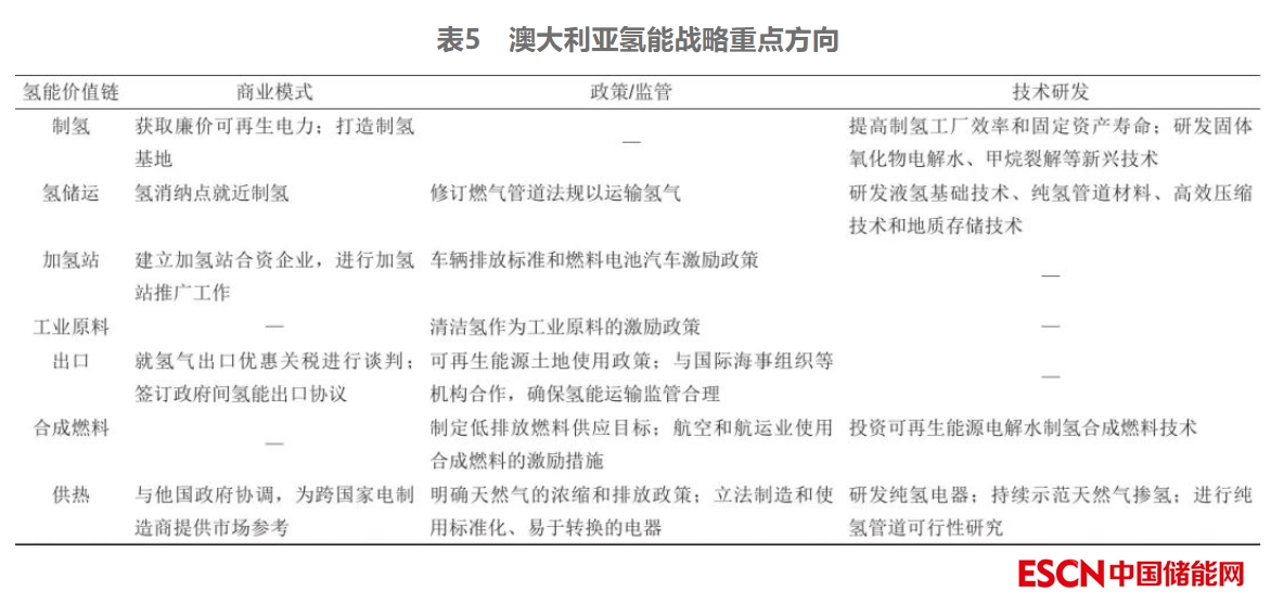 在全球氫能發(fā)展熱潮之下,澳大利亞將自身定位為清潔氫能供應(yīng)者角色,積極擴(kuò)展氫能海外供應(yīng)合作,并與相關(guān)國家和企業(yè)開展技術(shù)合作,力爭搶占?xì)淠芄?yīng)鏈上游,鞏固全球能源貿(mào)易大國地位。2019年澳大利亞政府發(fā)布了《國家氫能戰(zhàn)略》,確定了15大發(fā)展目標(biāo)、57項(xiàng)聯(lián)合行動(dòng),力爭到2030年成為全球氫能產(chǎn)業(yè)的主要參與者,2050年綠氫產(chǎn)能達(dá)到3000萬噸/年。澳大利亞既積極發(fā)展可再生能源電解水制氫,也推進(jìn)化石能源耦合CCS(碳捕捉與封存)制氫產(chǎn)業(yè)發(fā)展。澳大利亞各州也積極跟進(jìn),昆士蘭、南澳大利亞、維多利亞等州出臺(tái)了針對(duì)轄區(qū)內(nèi)的氫能發(fā)展專項(xiàng)規(guī)劃。