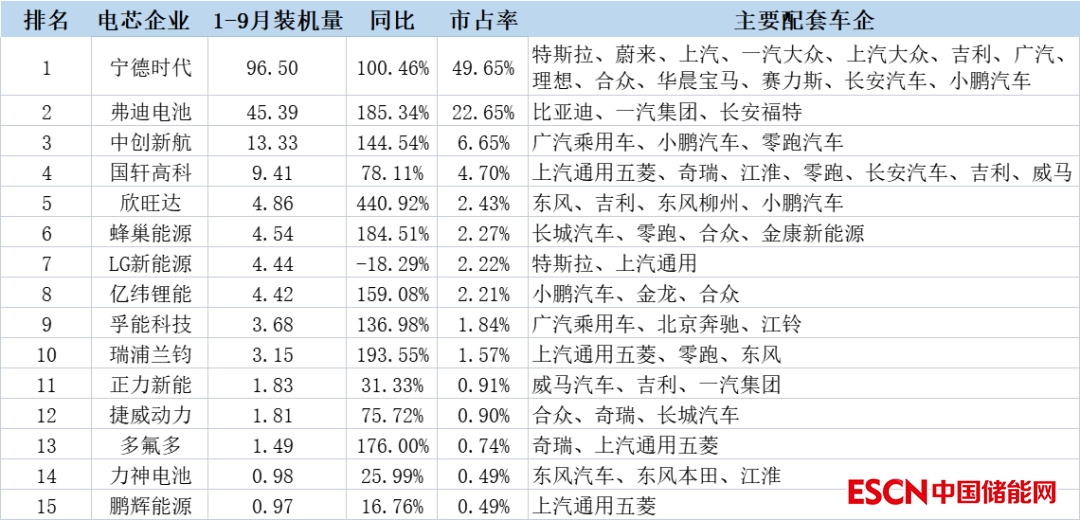今年前三季度,寧德時(shí)代動(dòng)力電池裝機(jī)量96.5GWh,市占率為49.65%,繼續(xù)領(lǐng)跑。