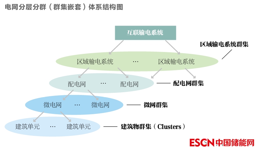 互聯(lián)輸電系統(tǒng)是若干個平衡區(qū)(即區(qū)域性輸電網(wǎng))互聯(lián)起來的群集(clusters),每個平衡區(qū)是一個集群;每個區(qū)域性輸電網(wǎng)是若干個配電網(wǎng)互聯(lián)起來的群集,每個配電網(wǎng)是若干個微網(wǎng)、建筑單元組成的群集,每個微網(wǎng)又可以是由若干個建筑單元互聯(lián)起來的群集,由此形成多層的群集層次結(jié)構(gòu)。如果這個圖扁平化,則形成群集嵌套。