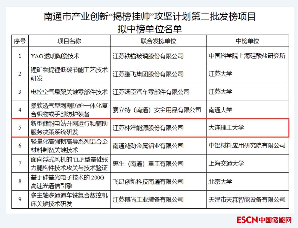 中國(guó)儲(chǔ)能網(wǎng)訊:近日,南通市科學(xué)技術(shù)局對(duì)南通市產(chǎn)業(yè)創(chuàng)新“揭榜掛帥”攻堅(jiān)計(jì)劃第二批發(fā)榜項(xiàng)目擬中榜單位進(jìn)行公示,林洋能源“新型儲(chǔ)能電站并網(wǎng)運(yùn)行和輔助服務(wù)決策系統(tǒng)研發(fā)”項(xiàng)目,通過(guò)形式審查、同行評(píng)議、項(xiàng)目公示、專家認(rèn)證等層層遴選,成功獲批2022年度南通市產(chǎn)業(yè)創(chuàng)新第二批“揭榜掛帥”攻堅(jiān)計(jì)劃聯(lián)合發(fā)榜項(xiàng)目,最終由公司產(chǎn)學(xué)研合作單位大連理工大學(xué)成功中榜!
