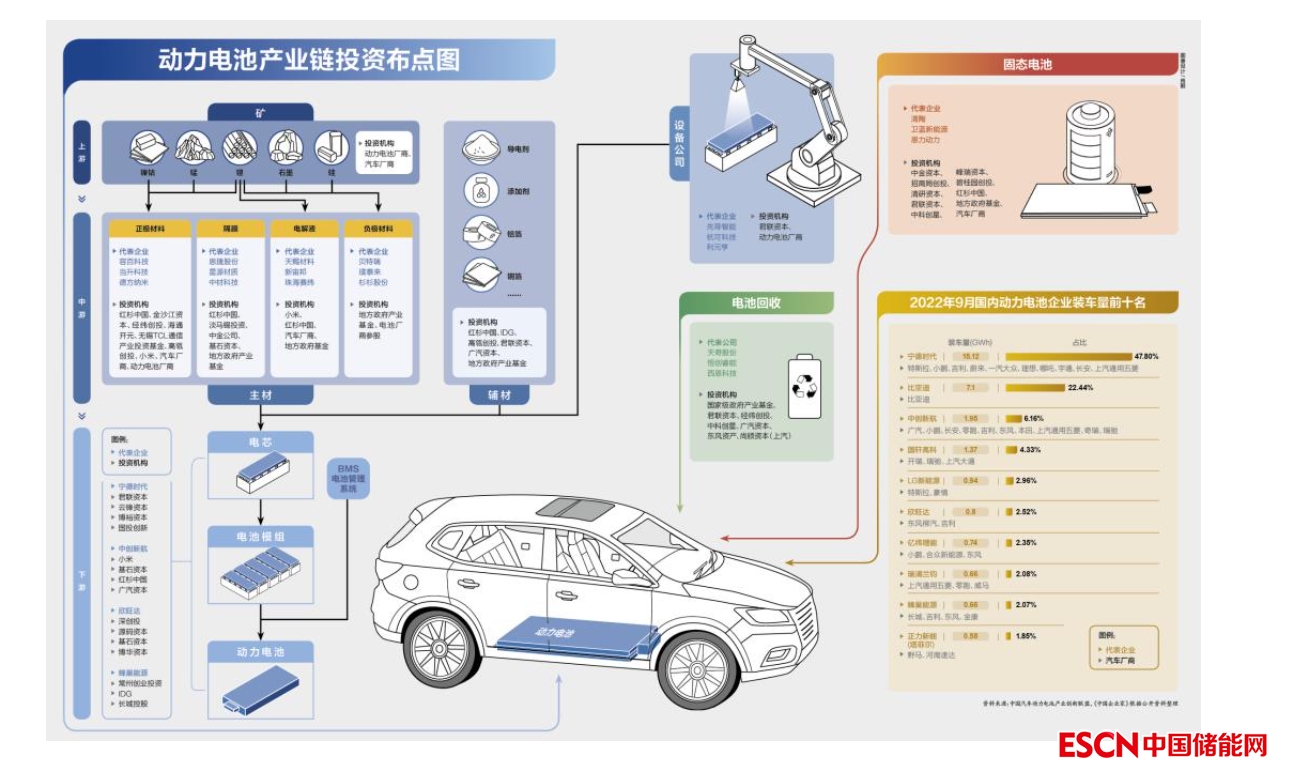 這個產(chǎn)業(yè)鏈在全球影響力也與日俱增,根據(jù)市場調(diào)研機構(gòu)SNE Research發(fā)布的數(shù)據(jù),2022年上半年全球動力電池裝機量排名前十的企業(yè)中,中國企業(yè)就占6家,市場份額合計56.4%。廣汽資本對動力電池上游材料供應(yīng)鏈的版圖梳理顯示,包括正極、負(fù)極、電解液、隔膜等主材,還有導(dǎo)電劑、銅箔等輔材在內(nèi),中國材料企業(yè)的市場占比達(dá)全球的80%。