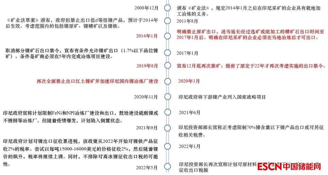 自2008年以來,印度尼西亞出臺了一系列鎳產(chǎn)業(yè)的相關(guān)政策,兩次發(fā)布政策禁止原礦出口,中國從印度尼西亞進口的原礦數(shù)量急劇減少,國內(nèi)在印度尼西亞布局冶煉產(chǎn)業(yè)的企業(yè)增多,中間品進口數(shù)量增加。2022年5月,印度尼西亞投資部長再次宣稱計劃對原材料金屬含量低于70%的加工商品征收出口稅額。同年8月19日,總統(tǒng)佐科?維多多稱,或?qū)⒃诮衲陮︽囌魇粘隹诙?。新能源汽車在全球范圍?nèi)的產(chǎn)銷量持續(xù)增長,帶動著鋰、鎳、鈷金屬需求量的激增,作為鎳金屬的主要生產(chǎn)國和出口國,印度尼西亞雖受益于鎳價上漲,但總統(tǒng)仍希望本國在全球電動汽車供應(yīng)鏈的地位可以進一步提升,能夠停止所有原料鎳的出口,延長本國產(chǎn)業(yè)鏈,提高產(chǎn)品的附加值。
