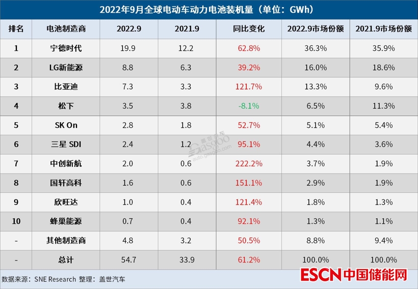 中國儲能網訊:日前,韓國市場研究機構SNE Research公布的數據顯示,2022年9月,全球電動汽車電池裝機量達54.7 GWh,同比增長61.2%。盡管新冠疫情蔓延等不利因素導致電池原材料供需困難,但全球電動汽車電池市場已經連續(xù)27個月保持穩(wěn)定增長。