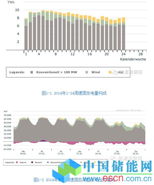 回答一:否。在能源資源枯竭預(yù)期、環(huán)境保護(hù)、應(yīng)對(duì)氣候變化等客觀約束下,擺脫化石能源依賴成為人們對(duì)未來(lái)能源圖景的最美好愿望,但實(shí)現(xiàn)遠(yuǎn)比愿望殘酷。由于光伏和風(fēng)電受天氣條件影響,發(fā)電出力具有間歇性和不穩(wěn)定性,用專業(yè)術(shù)語(yǔ)講,就是容量可信度(capacity credit)很低。以德國(guó)為例,2014年第1-24周(2013年12月30日-2014年6月15日)德國(guó)各類型發(fā)電量構(gòu)成如圖1-1所示??梢钥闯觯夥娏吭诿恳恢芾锼嫉谋壤顒e非常大。尤其是在第四周(1月20-26日,如圖1-2),光伏最大瞬時(shí)出力僅為410萬(wàn)千瓦,僅占光伏總裝機(jī)容量的11%。該周內(nèi)光伏發(fā)電量?jī)H為8000萬(wàn)千瓦時(shí),相當(dāng)于每天光伏滿負(fù)荷運(yùn)行時(shí)間僅為18分鐘。在光伏、風(fēng)電均不給力的情況下,需要煤電、氣電、核電等常規(guī)電源頂上。