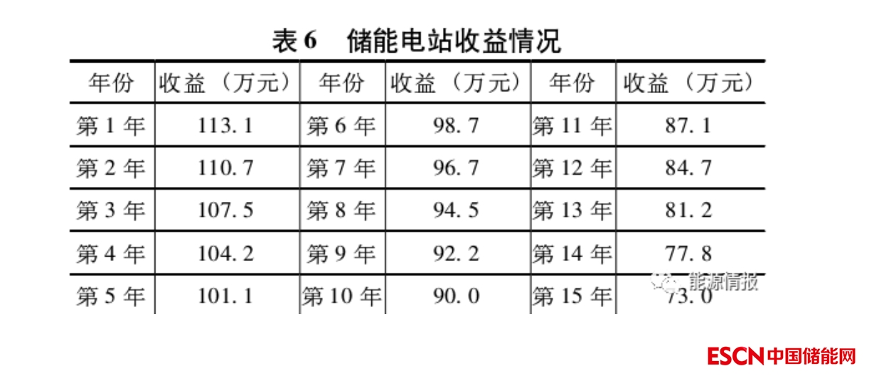 按儲(chǔ)能電站15年的設(shè)計(jì)壽命與取50%的放電深度進(jìn)行測算,以現(xiàn)有電價(jià)政策保持不變的情況下,則該儲(chǔ)能電站在其規(guī)定的使用年限內(nèi)的靜態(tài)收益情況見表6。