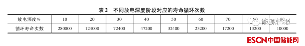 儲(chǔ)能電站內(nèi)電池的壽命循環(huán)次數(shù)受溫度、放電功率、充放電狀態(tài)轉(zhuǎn)換及放電深度(DepthOfDischarge,DOD)等因素的影響。電池的放電深度與循環(huán)次數(shù)的關(guān)系可視為在倍率不變的條件下降低放電深度能夠延長電池壽命,同樣的壽命周期可以輸出更多的能量,對(duì)壽命循環(huán)次數(shù)的影響較大。本文以某型號(hào)的鉛酸電池參數(shù)為依據(jù),計(jì)算電池的循環(huán)壽命次數(shù)。該電池在不同放電深度階段對(duì)應(yīng)的壽命循環(huán)次數(shù)如表2所示。