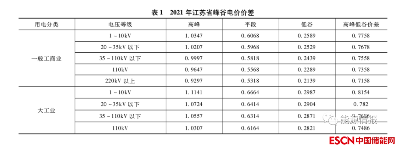 所謂峰谷套利,即利用儲(chǔ)能的能量存儲(chǔ)功能,將谷時(shí)的電能存儲(chǔ)起來并在峰時(shí)釋放出來,通過峰谷電價(jià)差獲取收益。為提高收益,有時(shí)也會(huì)考慮平時(shí)段充電峰時(shí)段放電,獲得峰平價(jià)差收益。利用峰谷價(jià)差套利是目前用戶側(cè)儲(chǔ)能最主要的盈利方式。2021年,國家發(fā)改委發(fā)布《關(guān)于進(jìn)一步完善分時(shí)電價(jià)機(jī)制的通知》,要求系統(tǒng)峰谷差率超過40%的地方,峰谷電價(jià)價(jià)差原則上不低于4∶1,其他地方原則上不低于3∶1,尖峰電價(jià)在峰段電價(jià)基礎(chǔ)上上浮比例原則上不低于20%。峰谷價(jià)差的拉大,為用戶側(cè)儲(chǔ)能蓄熱行業(yè)大規(guī)模發(fā)展奠定了基礎(chǔ)。表1為2021年江蘇省峰谷電價(jià)價(jià)差一覽表。