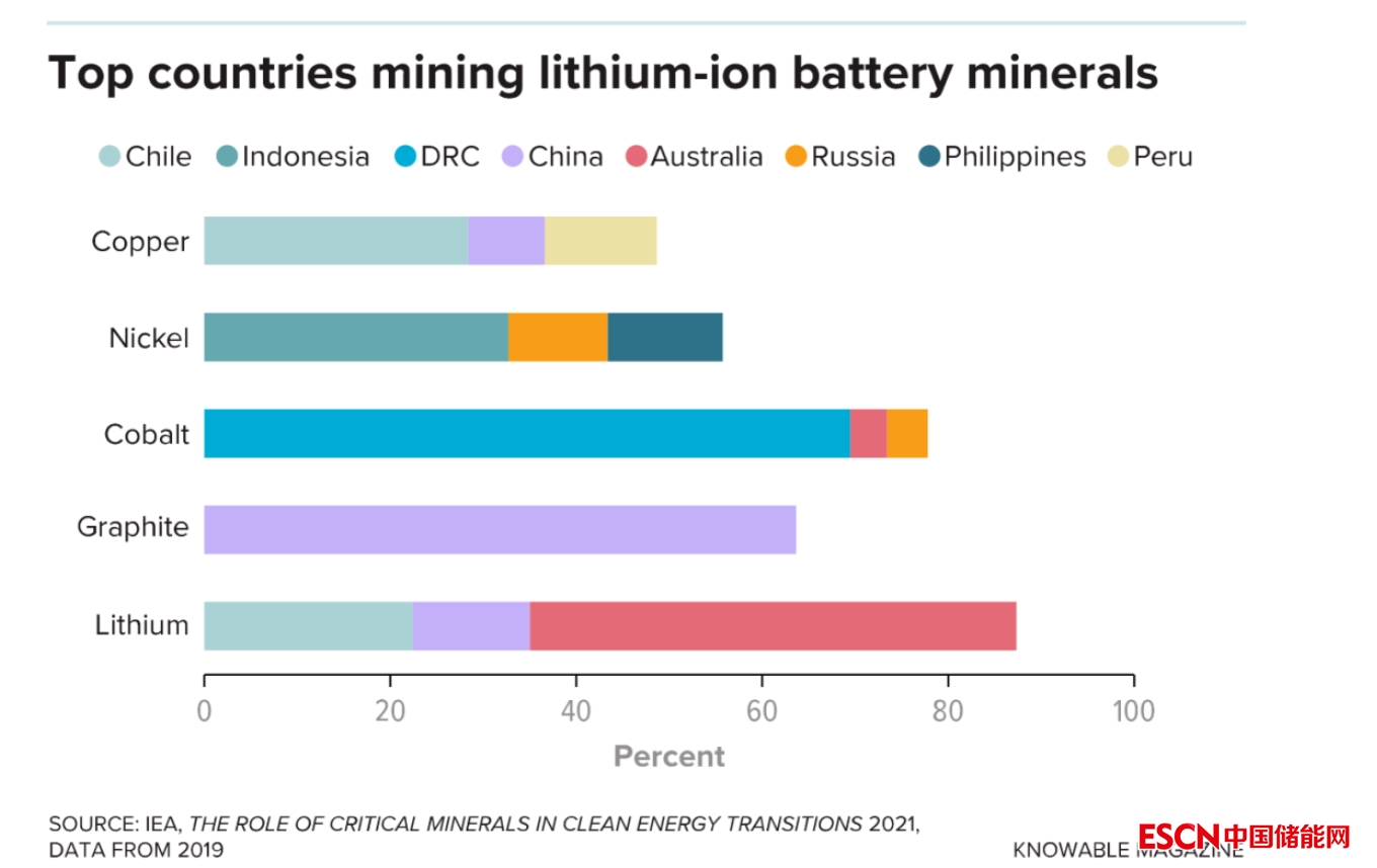 所有這些金屬都必須提取出來(lái),而且僅靠回收還不能滿足市場(chǎng)需求。盡管美國(guó)有很多銅礦(并從廢品回收中獲得相當(dāng)大一部分銅),但鋰離子電池中幾乎所有的其他金屬都來(lái)自其他國(guó)家的礦區(qū)。全球80%以上的鋰來(lái)自智利、澳大利亞和中國(guó),而60%以上的鈷來(lái)自剛果民主共和國(guó)。