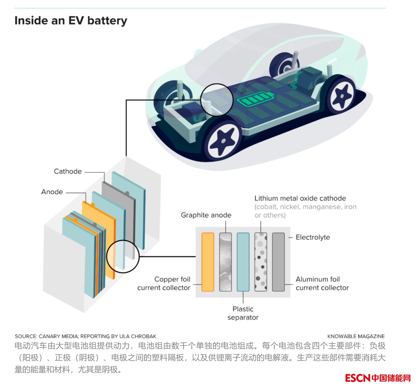 為了給汽車(chē)供電,電池中的電子從負(fù)極(即陽(yáng)極)移動(dòng)到正極(陰極)。通常情況下,陽(yáng)極由銅和石墨制成,而陰極由一類稱為鋰金屬氧化物的化合物組成,含有鋰以及鈷、錳和鎳等其他金屬。