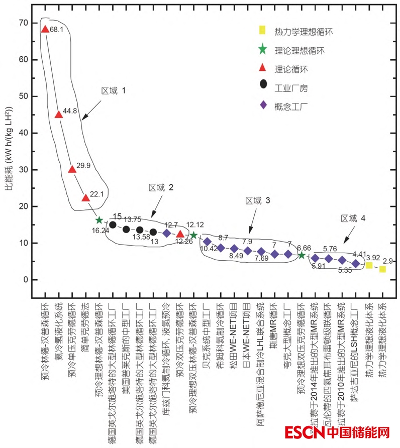 理想狀態(tài)下,氫氣液化耗能為3.92kWh/kg。目前的氫氣液化主要是通過液氮冷卻和壓縮氫氣膨脹實(shí)現(xiàn), 耗能為13~15kWh/kg, 幾乎是氫氣燃燒所產(chǎn)生低熱值 (產(chǎn)物為水蒸氣時的燃燒熱值,33.3kWh/kg)的一半,而氮?dú)獾囊夯哪軆H為0.207kWh/kg,因此降低氫氣液化耗能至關(guān)重要。不同氫液化方法的能耗如上圖所示。