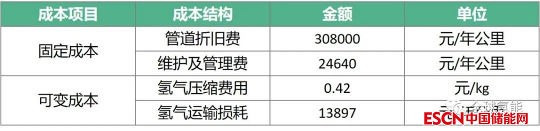 管道氫氣運(yùn)輸?shù)某杀局饕ü艿澜ㄔO(shè)費(fèi)用折舊與攤銷、直接運(yùn)行維護(hù)費(fèi)用(材料費(fèi)、維修費(fèi)、輸氣損耗、職工薪酬等)、管理費(fèi)及氫氣壓縮成本等。如果對管道輸氫的成本做一筆運(yùn)算,以“濟(jì)源-洛陽”項目為例,“濟(jì)源-洛陽”項目輸氣管道全長25km,設(shè)計壓力4.0Mpa,管道規(guī)格DN500mm,輸氣能力為10.04萬噸/年,配套建設(shè)2座站場,項目總投資1.5429億元。采用φ508mm管道,建設(shè)成本為616萬/km,管道使用壽命20年。運(yùn)行期間維護(hù)成本及管理費(fèi)用按建設(shè)成本的8%計算。據(jù)統(tǒng)計氫氣管道在滿載輸送過程中損耗為1252kg/km年。成本計算數(shù)據(jù)如下表所示