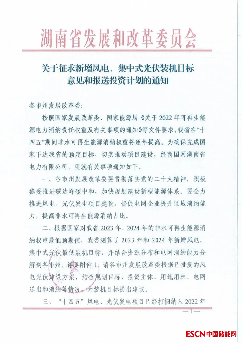 中國(guó)儲(chǔ)能網(wǎng)訊:近日,湖南省發(fā)改委發(fā)布《關(guān)于征求新增風(fēng)電、集中式光伏裝機(jī)目標(biāo)意見(jiàn)和報(bào)送投資計(jì)劃的通知》。