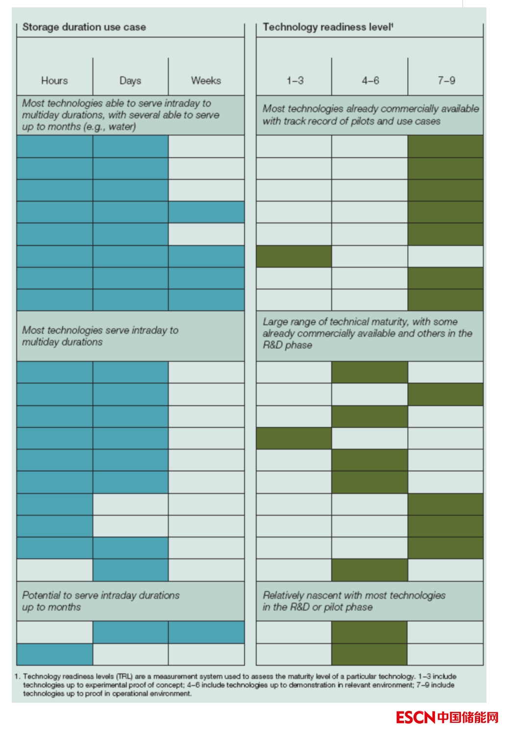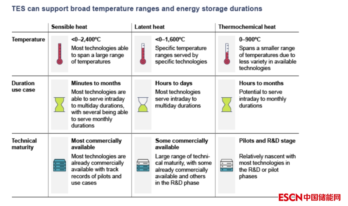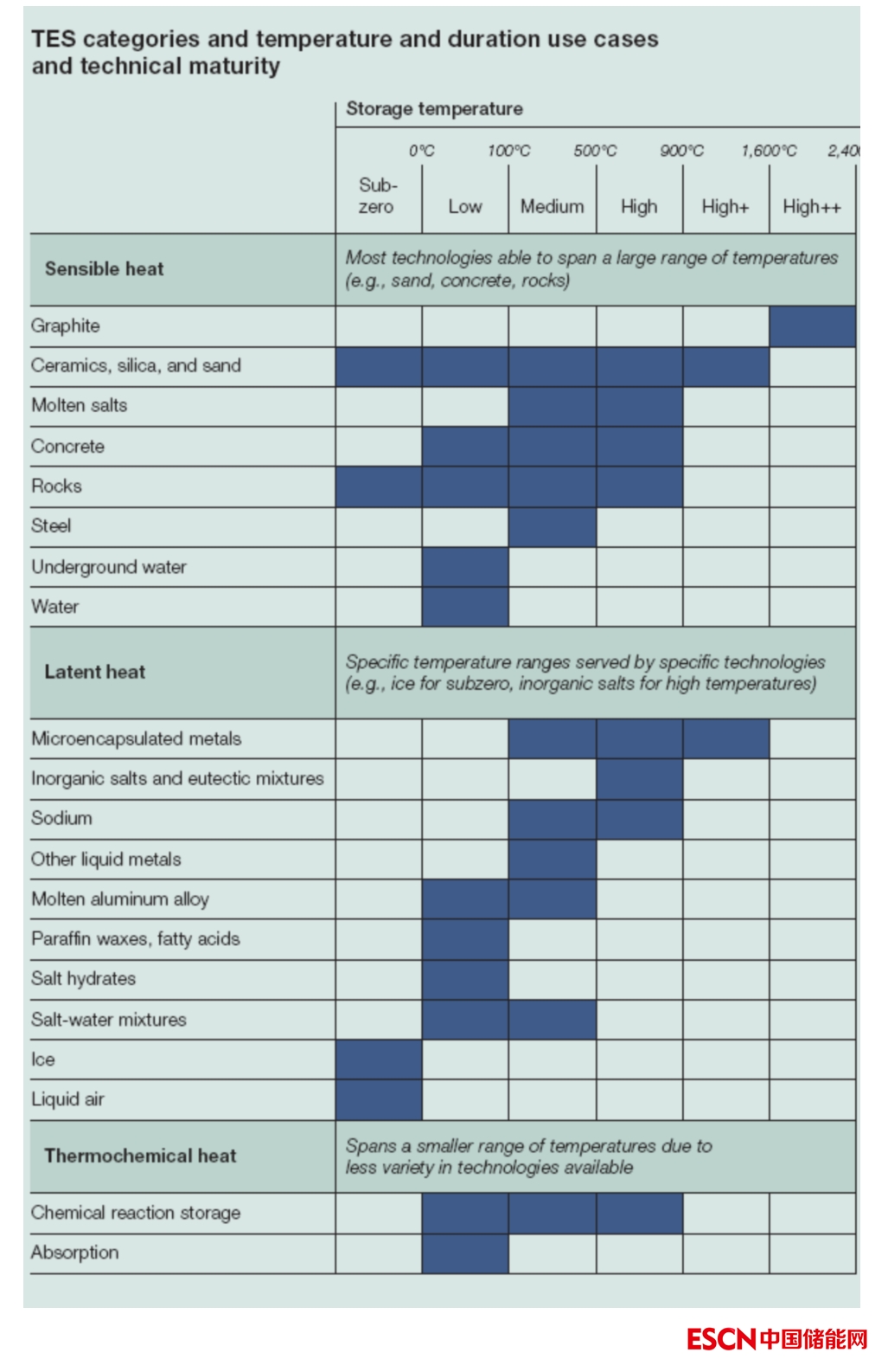 表1 熱儲(chǔ)能類別、溫度和持續(xù)時(shí)間用例和技術(shù)成熟度