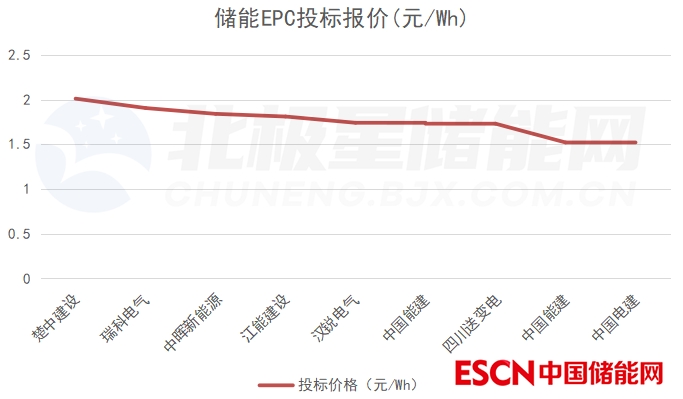 儲(chǔ)能EPC投標(biāo)報(bào)價(jià)最低的是中國(guó)電建華東院,投標(biāo)價(jià)為1.51元/Wh。投標(biāo)項(xiàng)目是國(guó)家能源集團(tuán)寧東復(fù)合光伏基地配套100MW/200MWh儲(chǔ)能電站EPC。最終,中國(guó)能建中電工程西北電力設(shè)計(jì)院預(yù)中標(biāo),中標(biāo)價(jià)格1.52元/Wh。