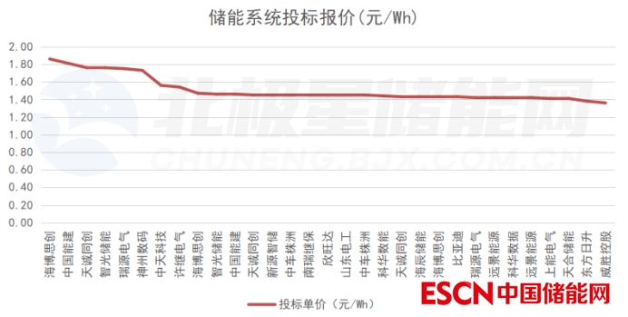 儲(chǔ)能系統(tǒng)投標(biāo)報(bào)價(jià)最低的為威勝電氣,投標(biāo)價(jià)1.36元/Wh,中標(biāo)的項(xiàng)目是中國(guó)電建湖北潛江市漁洋100MW漁光互補(bǔ)集中式共享儲(chǔ)能設(shè)備采購(gòu),該工程建設(shè)1座50MW/100MWh磷酸鐵鋰電池儲(chǔ)能站。