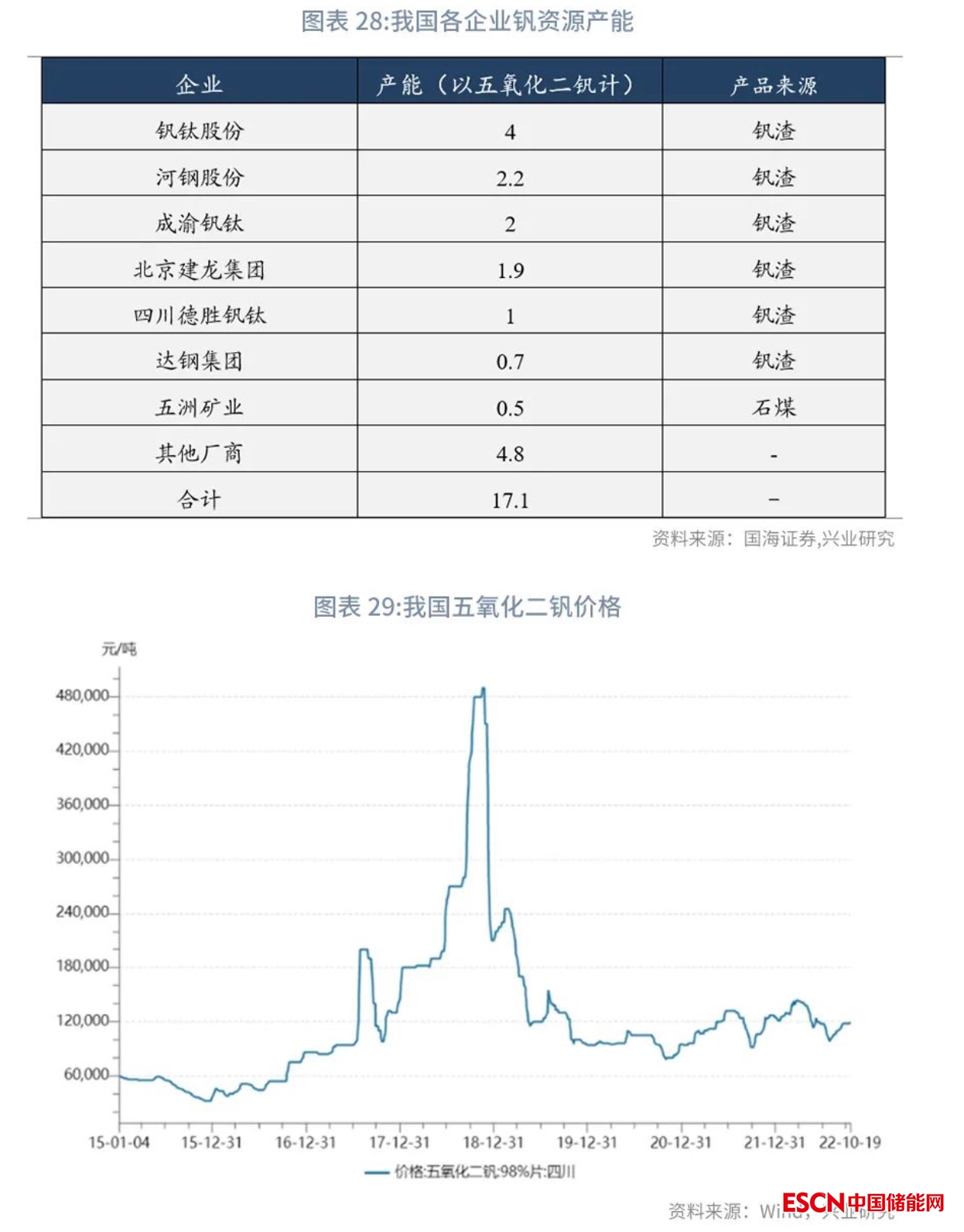 釩資源成本約占4h全釩液流電池成本的27%,且儲能時長越長,釩資源成本占比越高。全釩液流電池正極電解液由含有+4、+5價態(tài)離子的硫酸溶液組成,負極電解液是由含+2和+3價態(tài)離子的硫酸溶液組成,工業(yè)上一般采用電化學溶解法或化學還原法得到高濃度釩離子溶液。電解液成本占4h全釩液流電池成本的50%,釩資源成本占電解液成本的53%,釩資源價格對全釩液流電池成本影響較大。