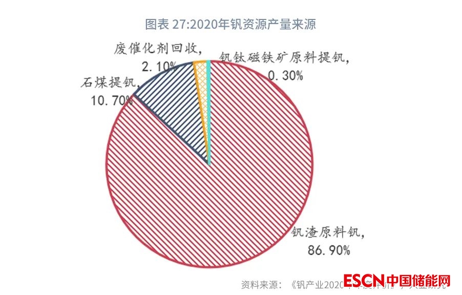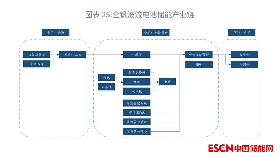 全釩液流電池產(chǎn)業(yè)鏈分為上游資源、中游制造集成和下游應用三個環(huán)節(jié)。其中,上游為釩資源的開采與冶煉;中游為全釩液流電池儲能系統(tǒng)的制造、集成和EPC,主要環(huán)節(jié)為電解液、電堆研發(fā)制造;下游為全釩液流電池儲能項目的投資運營。