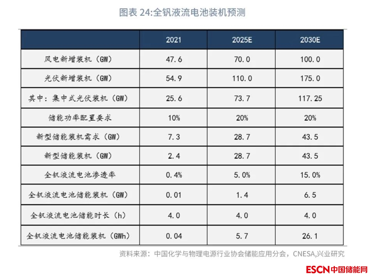 “十四五”時期全釩液流電池處于商業(yè)化初期,滲透率相對較低,但由于基數(shù)較低將實現(xiàn)階躍式發(fā)展?!笆奈濉睍r期發(fā)電側(cè)風光儲還不能平價,儲能項目盈利性一般,新能源配儲時長要求不高,配儲比例平均為10%,配儲時長平均為2h。預計2025年我國新型儲能新增裝機28.7GW,全釩液流電池滲透率將由2021年的0.4%提高至5%,新增裝機規(guī)模1.4GW/5.7GWh,“十四五”CAGR=246%,市場規(guī)??蛇_143億元,實現(xiàn)階躍式發(fā)展。