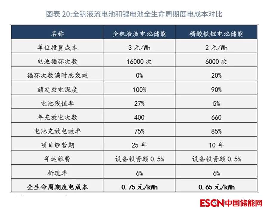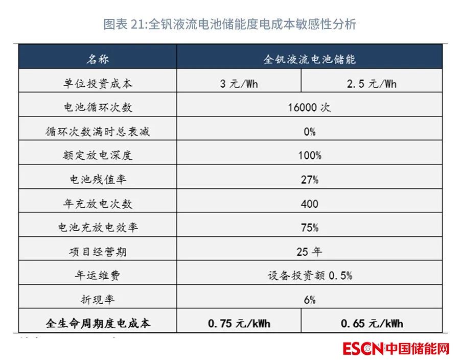如果儲能時長提高至8h,或未來全釩液流電池成本繼續(xù)下降,度電成本或可低于鋰電儲能。假設(shè)未來4h全釩液流電池儲能EPC造價下降至2.5元/Wh,或者采用8h全釩液流電池儲能,其EPC總造價為2.5元/Wh,其他參數(shù)不變情況下,重新計算全釩液流電池全生命周期度電成本,其度電成本為0.62元/kWh,將有望與鋰電池0.65元/kWh度電成本媲美。