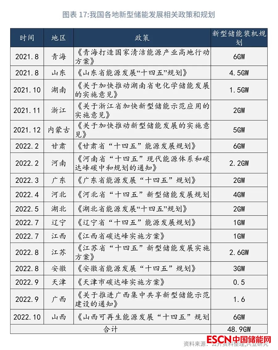“十三五”以來,我國密集出臺產(chǎn)業(yè)政策和規(guī)劃鼓勵新型儲能發(fā)展。2021年10月,國務(wù)院印發(fā)《2030年前碳達峰行動方案》,提出加快建設(shè)新型電力系統(tǒng),加快新型儲能示范推廣應用,到2025年,新型儲能裝機容量達到3000萬千瓦以上。我國各省基于區(qū)域能源發(fā)展的切實需求以及帶動新興產(chǎn)業(yè)發(fā)展的需求,相續(xù)發(fā)布“十四五”新型儲能發(fā)展目標。目前,包括青海、山東、湖南等17省市自治區(qū)的“十四五”新型儲能規(guī)劃目標,新型儲能裝機規(guī)模合計已達4890萬千瓦,已遠高于國家制定的3000萬千瓦的基礎(chǔ)目標。