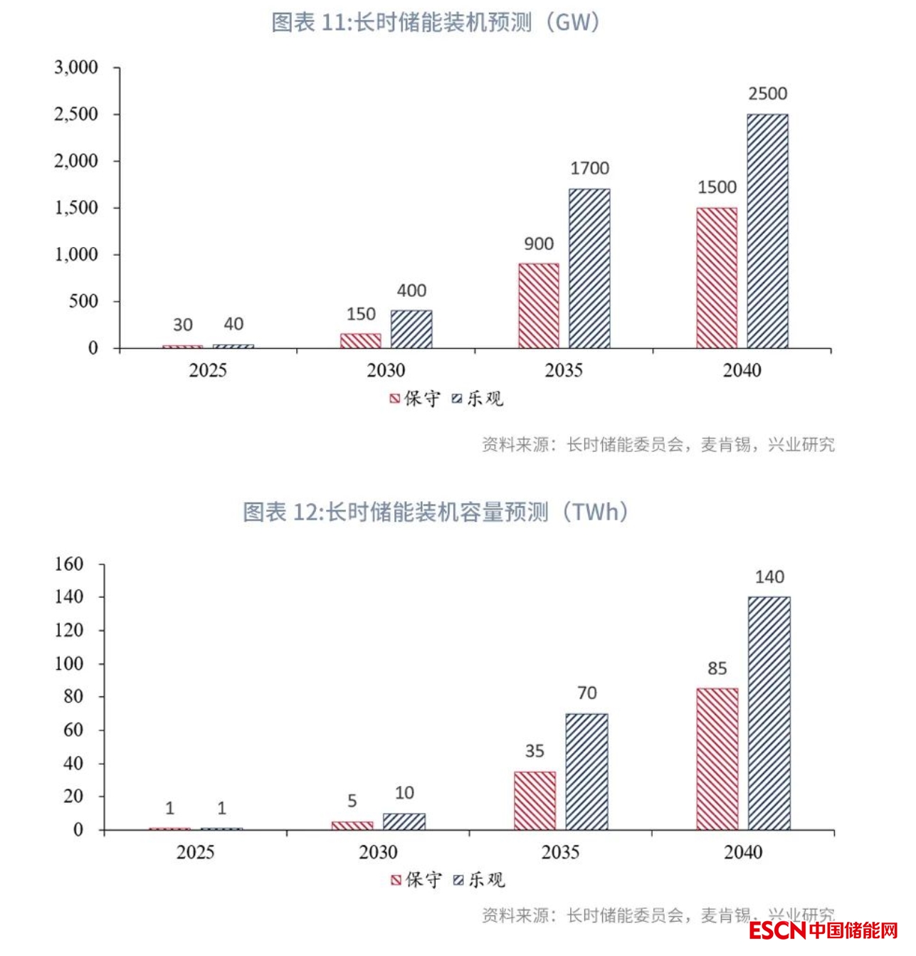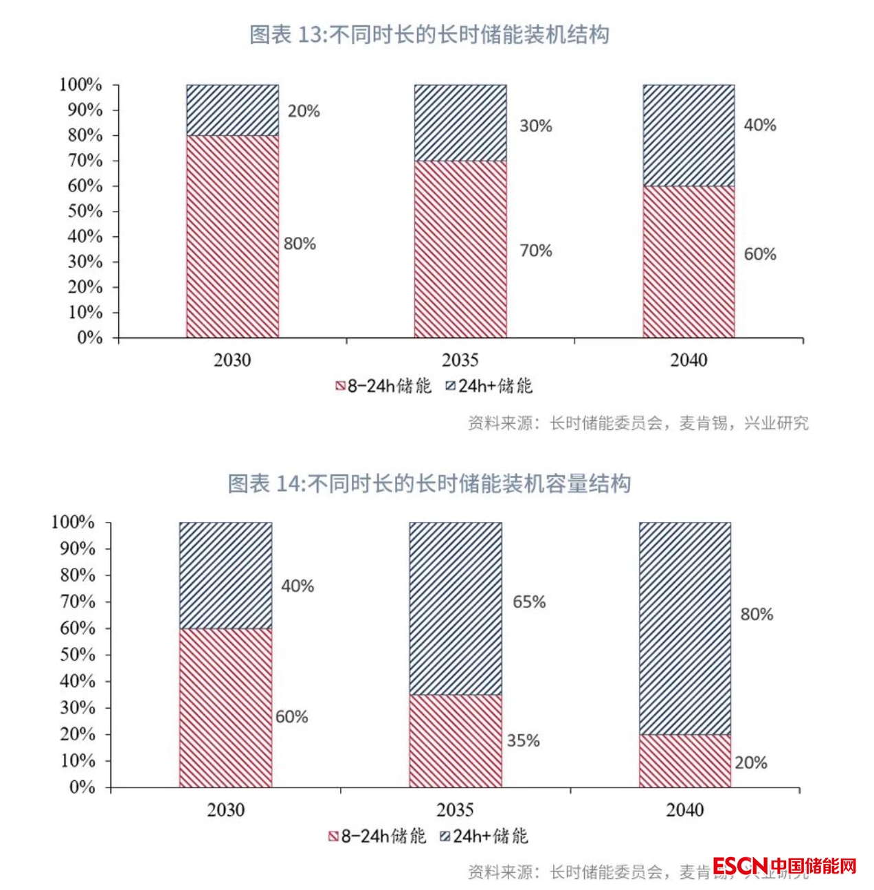 長時儲能委員會與麥肯錫聯(lián)合發(fā)布《Net-zero power:Long duration energy storage for a renewable grid》(2021年11月)提出長時儲能將于2025年開始大規(guī)模增長。報告指出全球已投入運營或已宣布部署的8h及以上長時儲能系統(tǒng)超過5GW和65GWh,全球已公示超過230個處于不同商業(yè)階段的長時儲能項目(不包括抽水蓄能)。報告預計,隨著可再生能源滲透率提升,2025年長時儲能全球累計裝機量將達到30—40GW/1TWh;2030年起全球可再生能源滲透率將升至60%—70%,長時儲能累計裝機量將達到150—400GW/5—10TWh;同時,報告提出,到2030年,預計儲能時長在24小時以上的儲能占比將快速提升,8-24小時的儲能裝機量可能占長時儲能裝機量的80%和總儲能容量的60%。