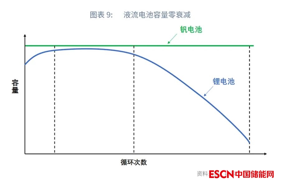 由于全釩液流電池正負活性物質(zhì)分別儲存在正負電解液儲槽中,避免了正負活性物質(zhì)的自放電消耗,滿充后可長期保持,極低的自放電率,幾乎可以忽略不計。而鋰電池自放電率約0.1-0.3%/天。