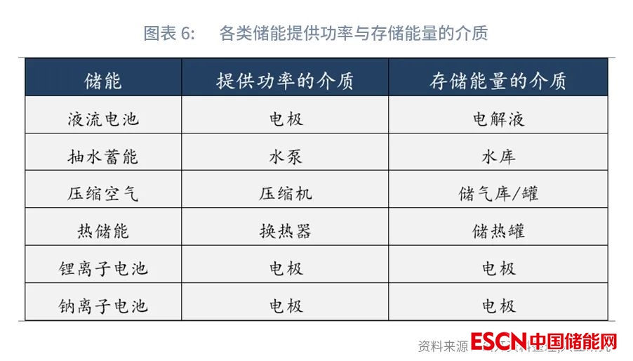 不同儲能技術(shù),提供功率和存儲能量的介質(zhì)有解耦和非解耦之分。相比鋰離子電池和鈉離子電池提供功率的介質(zhì)即為貯存能量的介質(zhì),液流電池儲能、抽水蓄能、壓縮空氣儲能和熱儲能提供功率的介質(zhì)和存儲能量的介質(zhì)是解耦的,配置更為靈活、且利于降本。