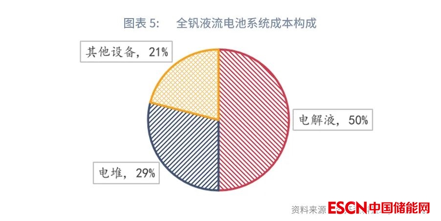 4h全釩液流電池成本中,電解液約占50%,電堆約占29%,其他設(shè)備成本占比約21%。