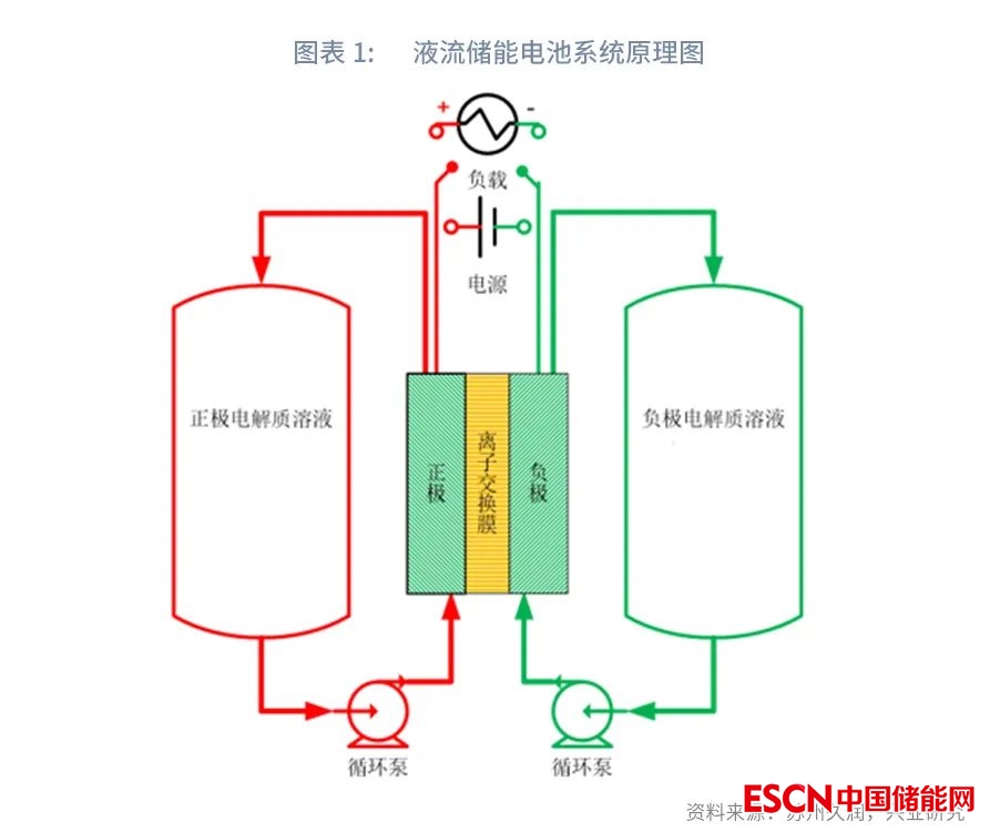 液流電池工作原理為通過外接泵與交換膜實現(xiàn)電化學反應。液流電池的正、負極電解液儲罐是完全獨立分離放置在堆棧外部的,通過兩個循環(huán)動力泵將正、負極電解液通過管道泵入液流電池堆棧中并持續(xù)發(fā)生電化學反應,通過將化學能與電能進行相互轉(zhuǎn)換作用來完成電能的儲存和釋放。