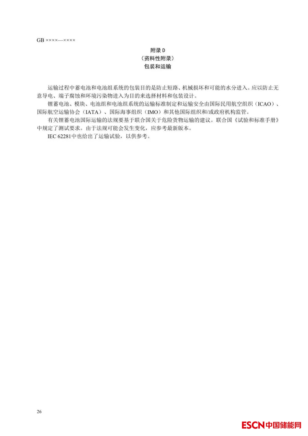 該文件適用于電能存儲(chǔ)系統(tǒng)用鋰蓄電池和電池組(以下簡稱為電池和電池組)。其中電能存儲(chǔ)系統(tǒng)包括:電信;中央應(yīng)急照明和報(bào)警系統(tǒng);固定式發(fā)動(dòng)機(jī)啟動(dòng);光伏系統(tǒng);家用(住宅)儲(chǔ)能系統(tǒng)(HESS);大容量儲(chǔ)能:并網(wǎng)/離網(wǎng)。