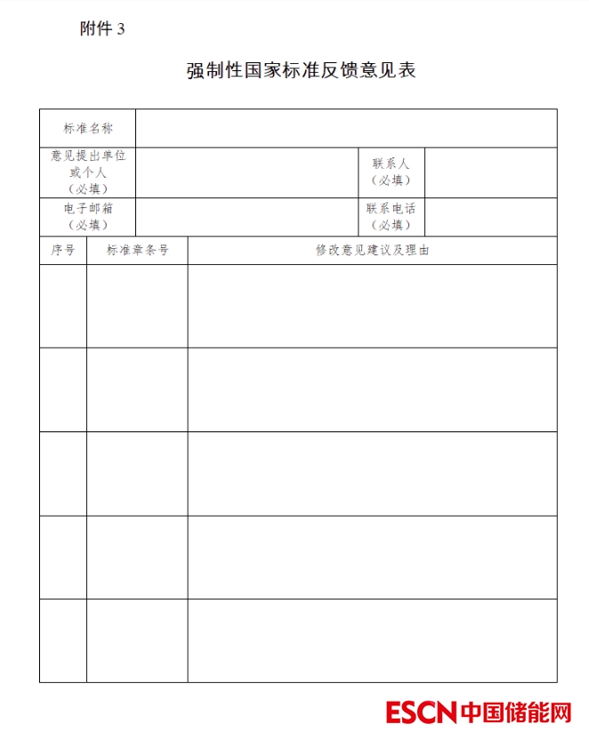 如有不同意見,請(qǐng)?jiān)诠酒陂g填寫《強(qiáng)制性國家標(biāo)準(zhǔn)反饋意見表》(見附件3),通過電子郵件發(fā)送至KJBZ@miit.gov.cn(郵件主題注明:《電能存儲(chǔ)系統(tǒng)用鋰蓄電池和電池組安全要求》等3項(xiàng)強(qiáng)制性國家標(biāo)準(zhǔn)征求意見稿公示反饋)。