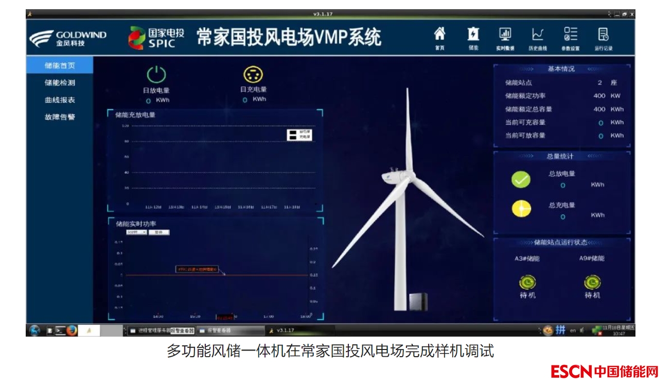 由于集中式儲(chǔ)能存在場(chǎng)地約束大、無法提升單機(jī)性能及調(diào)度權(quán)不受控等缺點(diǎn),風(fēng)儲(chǔ)一體機(jī)的研發(fā)對(duì)解決土地資源緊缺、提升風(fēng)機(jī)儲(chǔ)能協(xié)同能力、發(fā)電企業(yè)自主靈活調(diào)度提升資產(chǎn)收益率顯得至關(guān)重要。雖然目前國內(nèi)有少數(shù)風(fēng)儲(chǔ)一體機(jī)示范,但均只具備單一功能。此次上海能科牽頭研發(fā)的風(fēng)儲(chǔ)一體機(jī)集七大功能于一身,包括1.提高短期風(fēng)功率預(yù)測(cè)準(zhǔn)確率,降低雙細(xì)則考核費(fèi)用;2.減少棄風(fēng),提升單機(jī)發(fā)電量;3.通過峰谷電價(jià)差套利以及偏差考核控制,提升風(fēng)電場(chǎng)站電力現(xiàn)貨收益;4.通過風(fēng)儲(chǔ)協(xié)同參與電網(wǎng)一次調(diào)頻,降低風(fēng)機(jī)載荷壓力;5.具備風(fēng)機(jī)黑啟動(dòng)或孤島運(yùn)行功能,提升風(fēng)機(jī)運(yùn)行可靠性和靈活性;6.具備單臺(tái)風(fēng)儲(chǔ)一體機(jī)虛擬同步(VSG)功能,大幅提升風(fēng)機(jī)電網(wǎng)友好性;7.通過仿真測(cè)試了多風(fēng)儲(chǔ)一體機(jī)環(huán)境下的場(chǎng)站級(jí)VSG功能,可有效保障電網(wǎng)頻率與電壓穩(wěn)定。