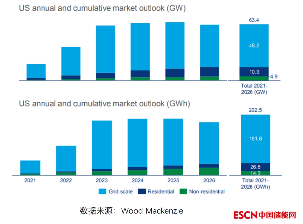 預(yù)計(jì)美國(guó)儲(chǔ)能2021-2026年總新增裝機(jī)規(guī)模將達(dá)到63.4GW/202.5GWh,其中戶用儲(chǔ)能裝機(jī)規(guī)模達(dá)到4.9GW/14.3GWh。