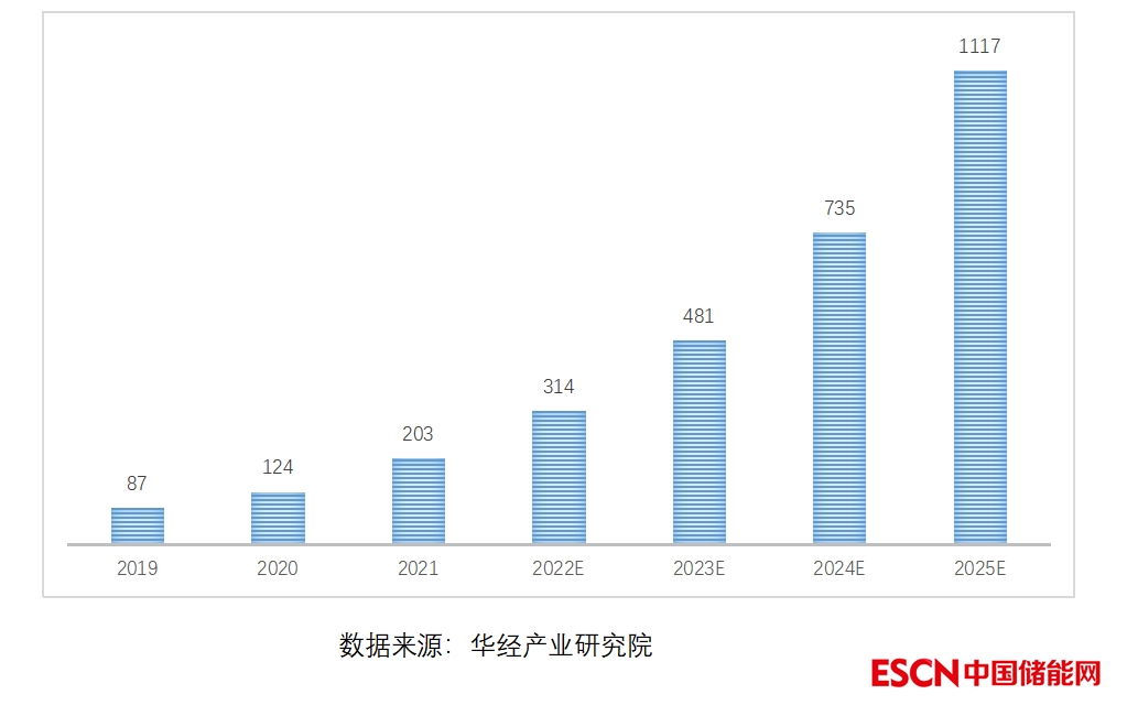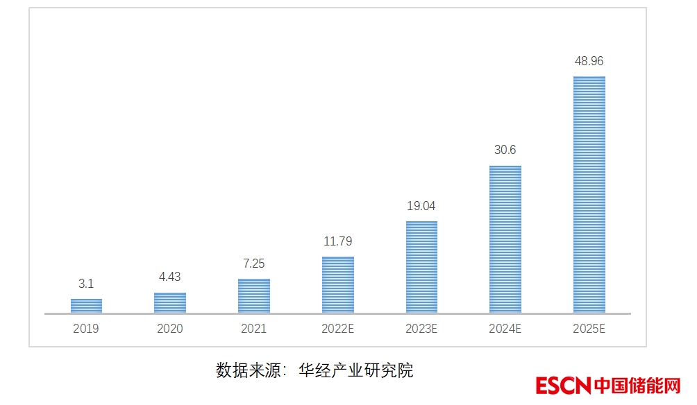 根據(jù)華經(jīng)產(chǎn)業(yè)研究院預(yù)測(cè),全球戶用儲(chǔ)能平均需求增速超過(guò)60%,2025年新增裝機(jī)需求達(dá)到48GWh。一套完整的家用儲(chǔ)能系統(tǒng)包括電池系統(tǒng)、逆變器、企業(yè)零部件,2021年戶用儲(chǔ)能平均硬件成本約為2.8元/wh,按照儲(chǔ)能系統(tǒng)平均5%成本下降預(yù)測(cè),預(yù)計(jì)2025年戶用儲(chǔ)能行業(yè)規(guī)模約為1117億元人民幣。