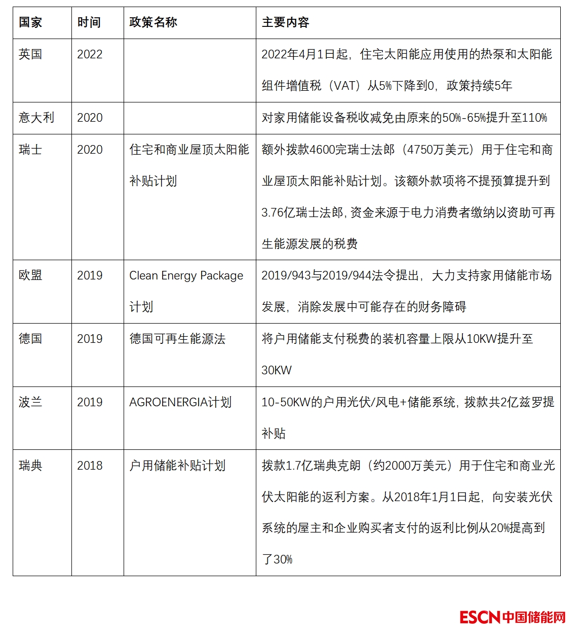 表1 歐洲戶用儲(chǔ)能政策(部分)