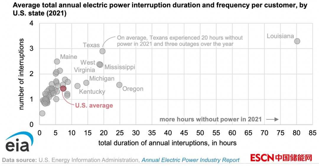 2021年,哥倫比亞特區(qū)、特拉華州、佛羅里達州、北達科他州和內(nèi)華達州的電力用戶停電總時間最短,從哥倫比亞特區(qū)的52分鐘到內(nèi)華達的102分鐘不等。同年,路易斯安那州、俄勒岡州、得克薩斯州、密西西比州和西弗吉尼亞州的用電戶經(jīng)歷了最長的停電時間,從西弗吉尼亞州的近19小時到路易斯安那的80多小時不等。路易斯安那州停電次數(shù)最多,其次是德克薩斯州。長時間停電主要是因為極端天氣事件,2021年美國經(jīng)歷了21次風(fēng)暴,這是有記錄以來大西洋第三活躍的天氣季節(jié)。除了2021年的四次嚴(yán)重颶風(fēng)外,還有一場冬季風(fēng)暴還影響了美國中部,北極空氣向南延伸至德克薩斯州。