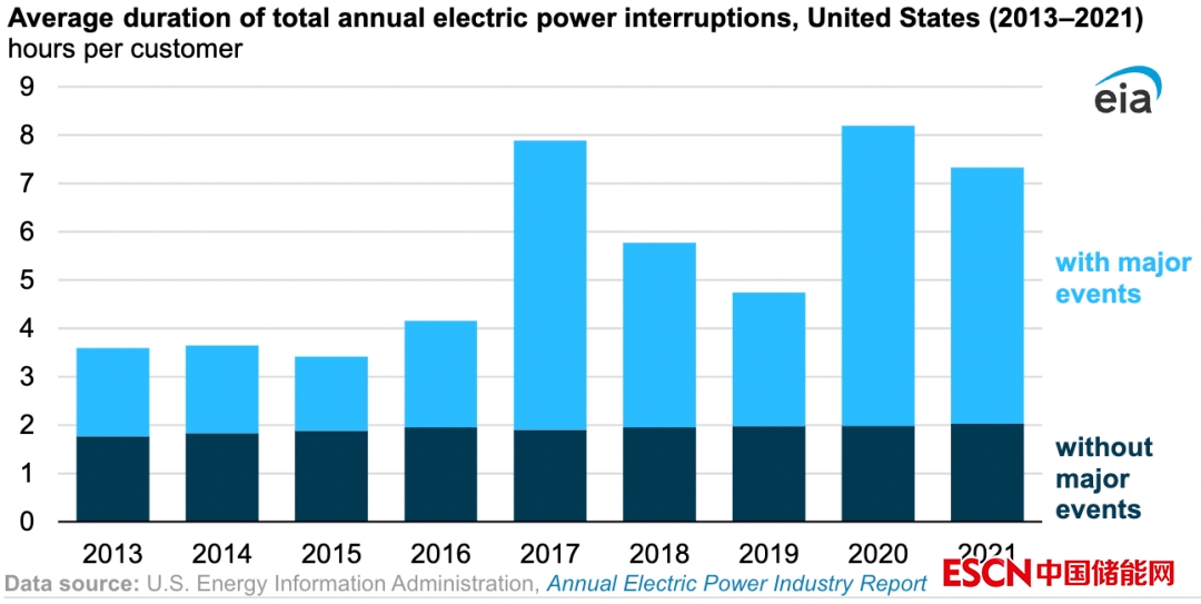 中國儲能網(wǎng)訊:據(jù)美國能源信息署的數(shù)據(jù),2021年美國電力用戶平均經(jīng)歷了7個多小時的電力中斷,比2020年少了一個小時。如果不包括暴風(fēng)雪、颶風(fēng)和野火等重大事件,2013年至2021年,每年的平均停電時間保持在大約2小時左右。