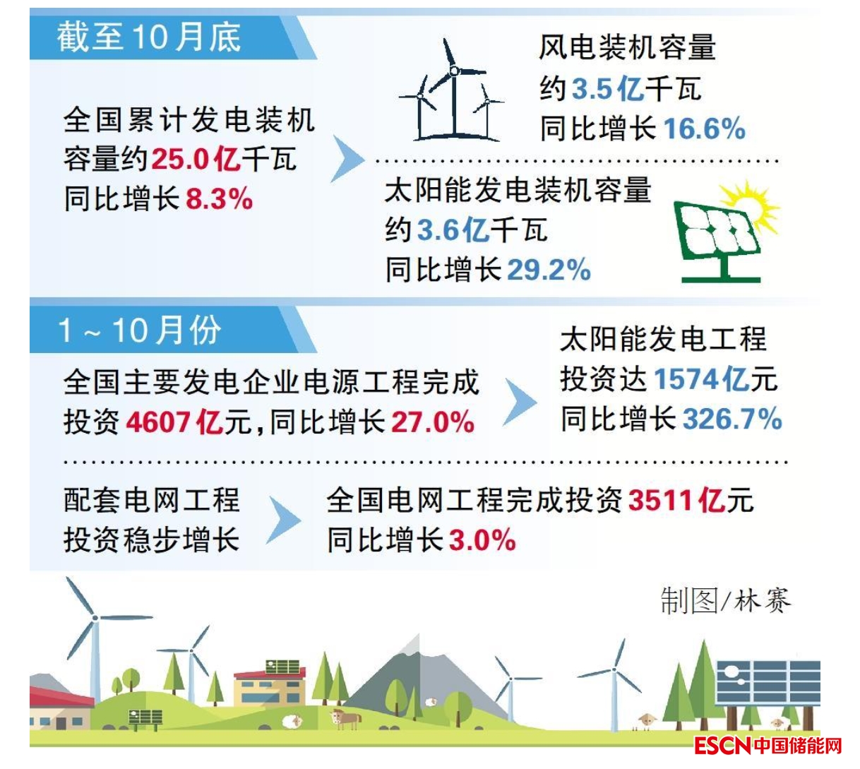 中國儲能網(wǎng)訊:從國家能源局網(wǎng)站獲悉,日前,國家能源局發(fā)布1~10月份全國電力工業(yè)統(tǒng)計數(shù)據(jù)。截至10月底,全國累計發(fā)電裝機(jī)容量約25.0億千瓦,同比增長8.3%。其中,風(fēng)電裝機(jī)容量約3.5億千瓦,同比增長16.6%;太陽能發(fā)電裝機(jī)容量約3.6億千瓦,同比增長29.2%。以上數(shù)據(jù)顯示,我國風(fēng)電、太陽能發(fā)電等新能源發(fā)展勢頭強勁,裝機(jī)規(guī)模保持快速增長,為我國經(jīng)濟(jì)社會發(fā)展提供了綠色動能。